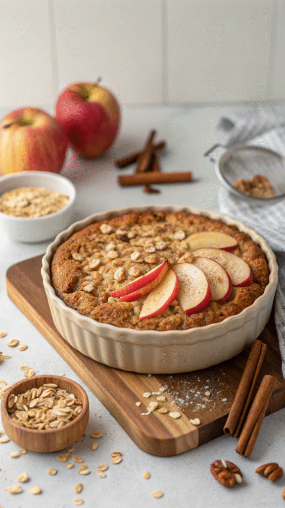 Recipe: Mix 2 cups oats, 2 cups milk, 2 eggs, 2 diced apples, cinnamon. Bake at 350°F for 35 minutes.