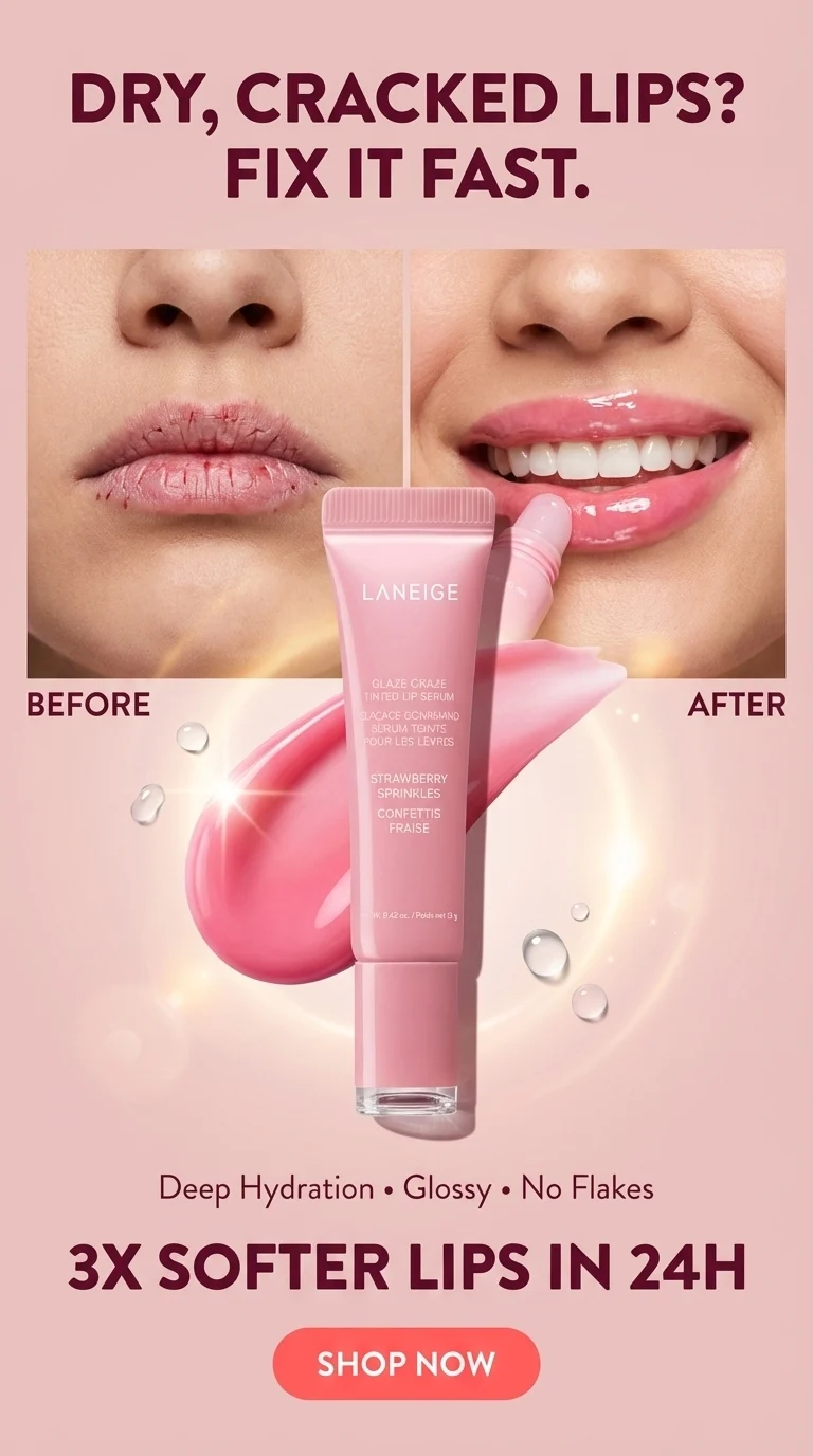 Tired of cracked lips? This LANEIGE Glaze Craze Tinted Lip Serum gives deep hydration + glossy plump lips. Try it now!